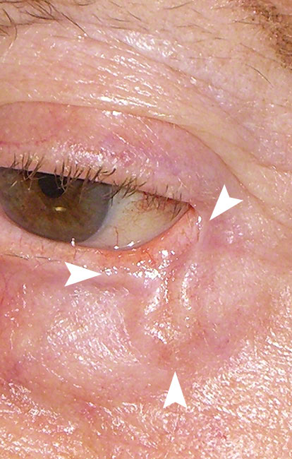 Ein Basaliom am Unterlid mit typischem Perlschnursaum und kleinem Defekt an der Lidkante. Bei dieser Lokalisation sind schon kleinere Geschwülste mit Lappenplastiken zu verschließen.