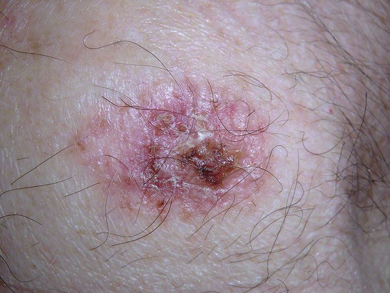 6 cm großes Basalzellkarzinom mit Schuppung und Krustenbildung. Die Rötung geht im Randbereich unscharf in die normale Haut über.