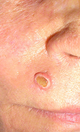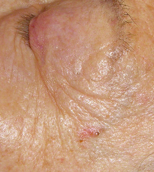 Ca. 0,5x1cm großes noduläres Basalzellkarzinom im Bereich der Krähenfüße. Bei dieser geringen Größe und der Lokalistion gestaltet sich die Enfernung unkompliziert.