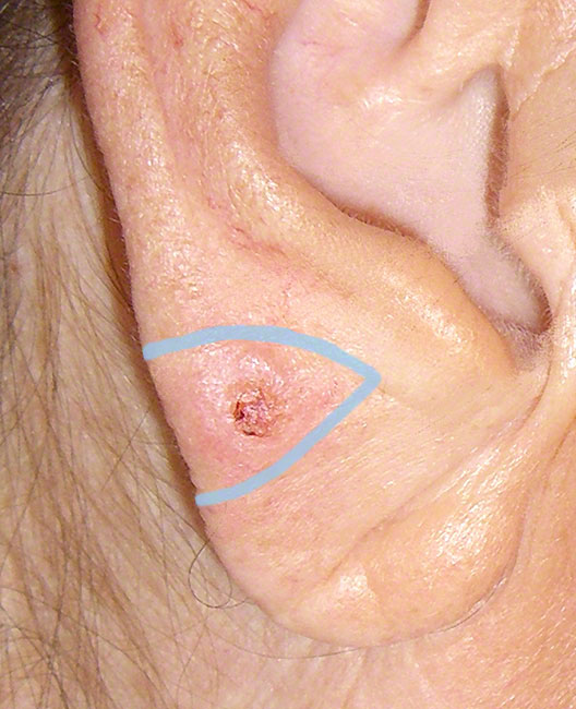 Kleiner ca. 8mm messender Tumor am Ohrläppchen. Die Verkrustung stellt nur ein Teil der Geschwulst dar. Drumherum ist auf diesem Bild ein Wall zu erkennen. Blau dargestellt ist der Bereich der mindestens entfernt werden muss.