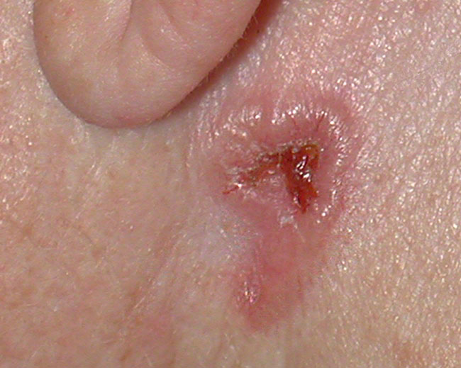 Hier sehen Sie ein Basalzellkarzinom am Ohr mit Krustenbildung und Schorf. Der Patient beschreibt es hätte sich innerhalb von 3-4 Jahren aus einer rötlichen Hautveränderung gebildet.